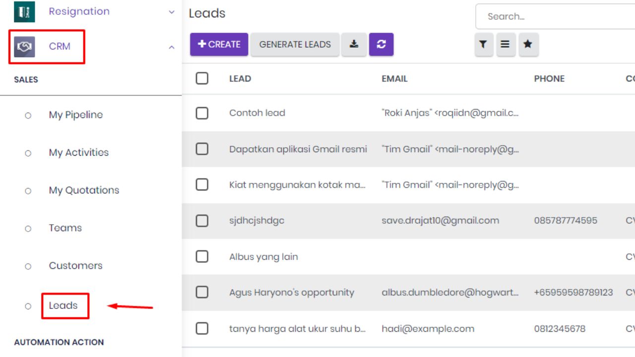 2. Kemudian setelah berhasil Log In, silahkan buka halaman Leads dengan cara klik menu “CRM” lalu pilih opsi “Leads”
